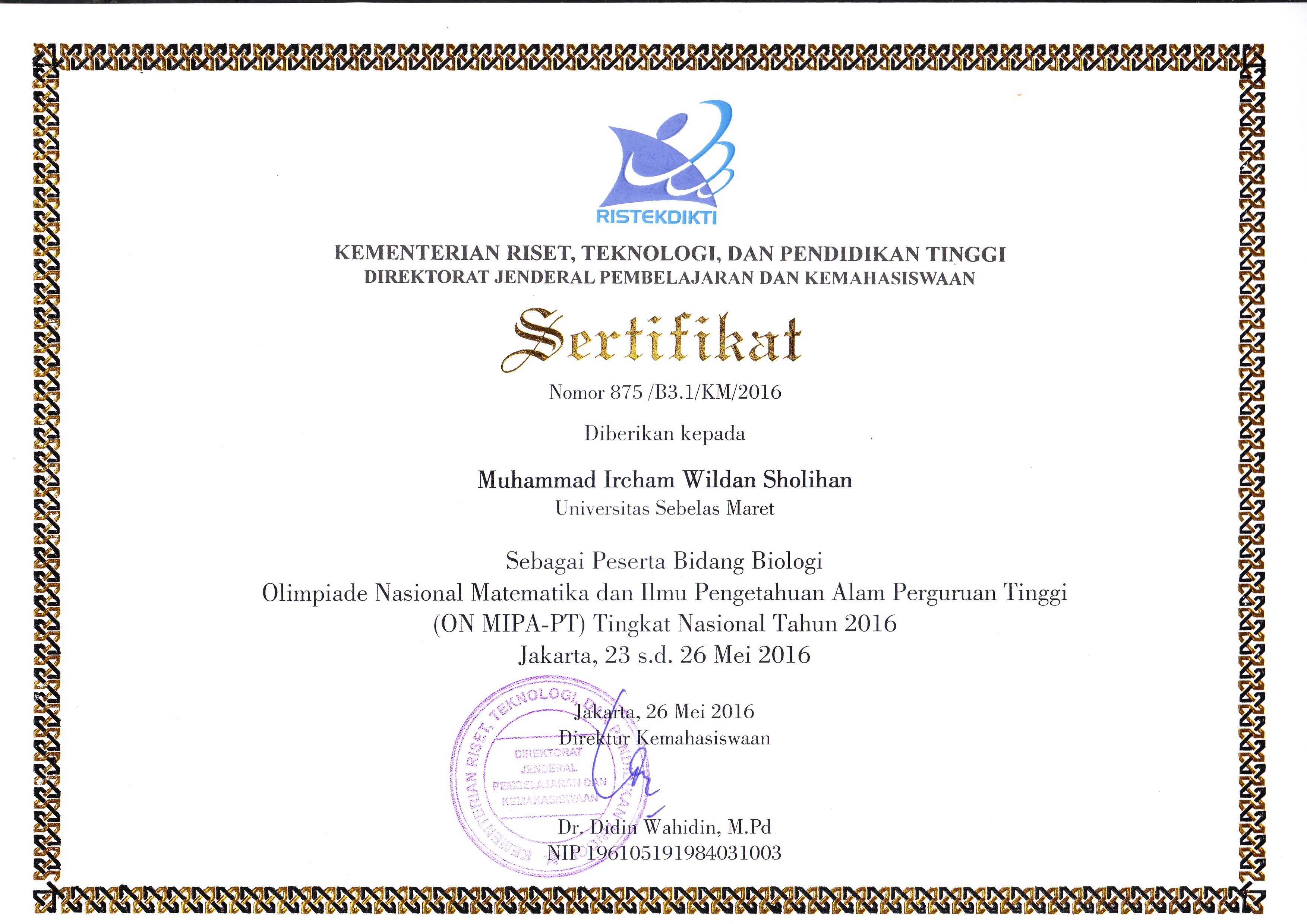 Muhammad Ircham Wildan Sholihan (WILDAN), Mahasiswa Prodi Pendidikan Biologi FKIP UNS semester 8 berhasil mendapat penghargaan sebagai Honorable Mention Bidang Biologi pada Olimpiade Nasional Matematika dan Ilmu Pengetahuan Alam (ON-MIPA) Tingkat Nasional Tahun 2016. Wildan merupakan wakil UNS bidang Biologi dalam ajang ON-MIPA Tingkat Nasional 2016 yang dilaksanakan di Jakarta pada tanggal 23 s.d. 26 Mei 2016. Semoga prestasi Wildan menjadi pemicu dan motivasi bagi adek-adek tingkat Prodi Pendidikan Biologi FKIP UNS untuk lebih hebat. (AL)