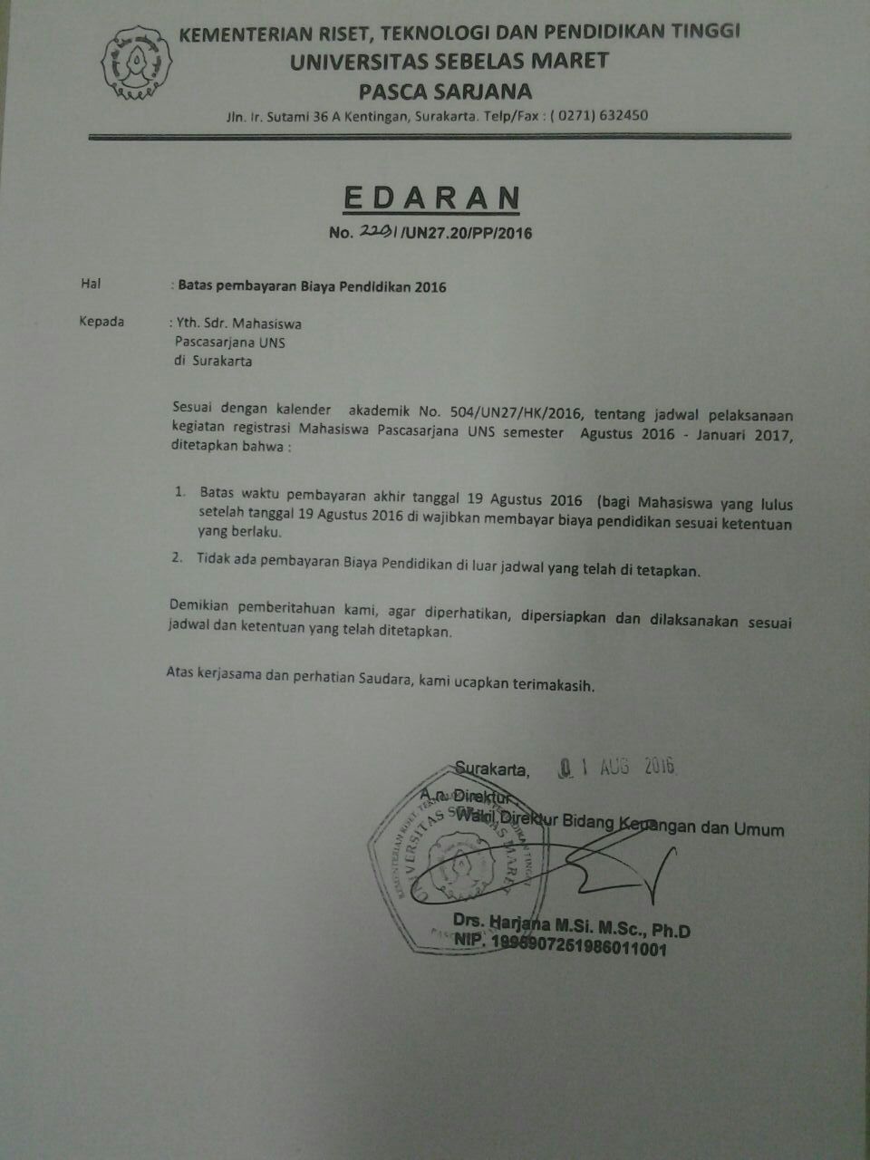 Batas pembayaran untuk Semester Agustus 2016 – Januari 2017 adalah Jum’at 19 Agustus 2016