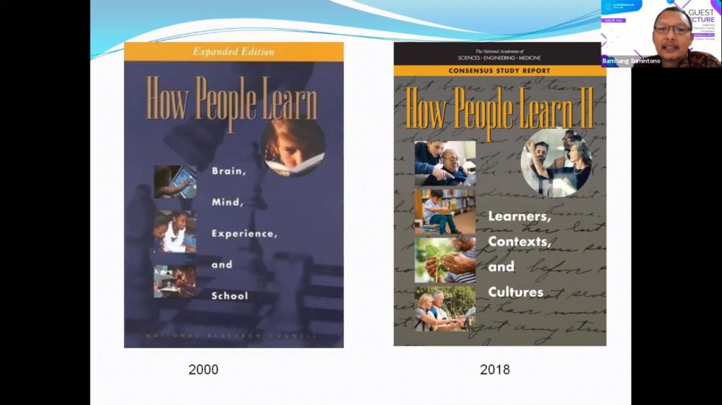 Pemaparan materi disampaikan oleh Prof. Bambang selama 50 menit. Ia mengawali pembahasan mengenai perkembangan kurikulum ilmu pengetahuan di Indonesia mulai dari kurikulum pra-1975 yang masih menekankan prinsip siswa dapat berpikir seperti ilmuwan hingga kurikulum 2013 yang menekankan pada penanaman karakter dan nilai serta keterampilan berpikir tingkat tinggi atau sering dikenal dengan istilah HOTS (High Order Thinking Skill).