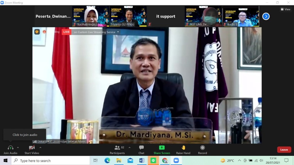Dihadiri oleh 130 peserta, webinar dibuka dengan sambutan Dekan FKIP UNS, Dr. Mardiyana, M.Si. Acara ini dimoderatori oleh Dr. Dewi Kusumawardani, M.Si. selaku Wakil Dekan II bidang SDM, Keuangan, dan Logistik. Adapun, dua pembicara yang hadir yaitu Prof. Dr. Sucihatiningsih Dian Wisika Prajanti, M.Si. selaku tim dari Penilaian Angka Kredit (PAK) Pusat dan Prof. Dr. Triyanto, S.H., M.Hum. selaku Guru Besar Ilmu Pendidikan Kewarganegaraan FKIP UNS.