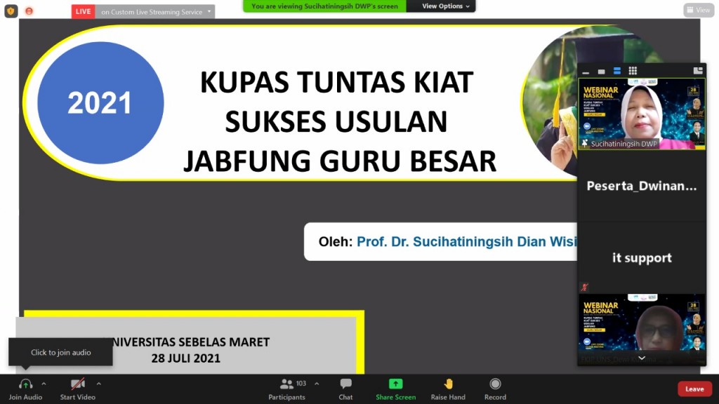 FKIP – Bidang Sumber Daya Manusia (SDM), Keuangan, dan Logistik Fakultas Keguruan dan Ilmu Pendidikan (FKIP) Universitas Sebelas Maret (UNS) Surakarta menggelar webinar dengan tema “Kupas Tuntas Kiat Sukses Usulan Jabatan Fungsional Guru Besar” melalui aplikasi Zoom Meeting pada Rabu (28/7/2021).