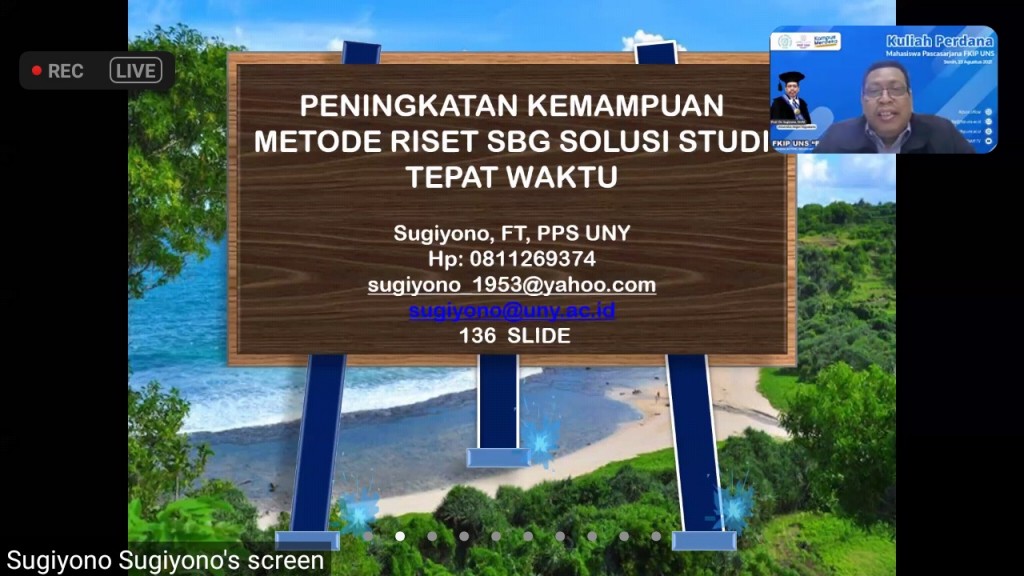 FKIP – Bidang Akademik, Riset, dan Kemahasiswaan Fakultas Keguruan dan Ilmu Pendidikan (FKIP) Universitas Sebelas Maret (UNS) Surakarta menyelenggarakan Kuliah Perdana Mahasiswa Baru Pascasarjana FKIP UNS dengan tema “Peningkatan Kemampuan Metodologi Riset sebagai Solusi Studi Tepat Waktu Mahasiswa Pascasarjana FKIP UNS di Masa Pandemi Covid-19” pada Senin (23/8/2021) melalui Zoom Cloud Meeting.