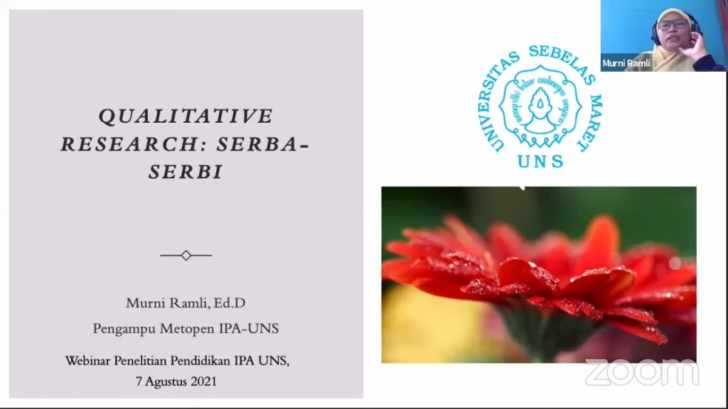 The activity was continued with a presentation session from the second speaker, namely Murni Ramli S.P., M.Sc., Ed.D. She explained the material on “Quaitative Research Sundries”. She hoped in this presentation, students who attend this webinar will get an idea of which research will be used for their thesis later.