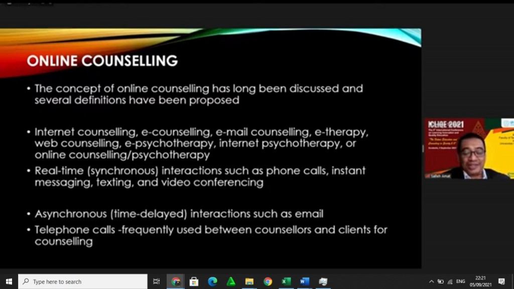 Pembicara pertama Prof.Madya Dr. Salleh Amat dari Universitas Kebangsaan Malaysia (UKM) memaparkan materi dengan topik “Kesiapan Konselor dalam Memberikan Layanan Konseling di Masa Pandemi Covid-19”. Meningkatnya kasus pandemi di berbagai negara memberikan dampak yang cukup serius terhadap kesehatan mental masyarakat.