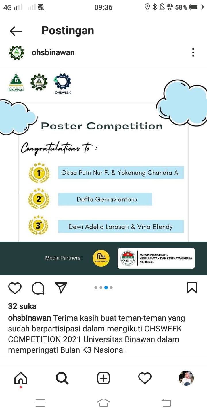Kegiatan OHSWEEK COMPETITION 2021 ini mengusung tema “Menciptakan Keselamatan dan Kesehatan bagi Diri dan Lingkungan selama Pandemi: Public Safety”. Kejuaraan dalam kegiatan ini diumumkan secara daring pada Minggu (22/8/2021) dengan hasil mahasiswa UNS menjadi pemenangnya (juara 1). Dalam perlombaan tersebut Yokanang mengusung judul “8 Tips JITU: Jaga Imun dan cegah Covid-19 di Transportasi Umum”.