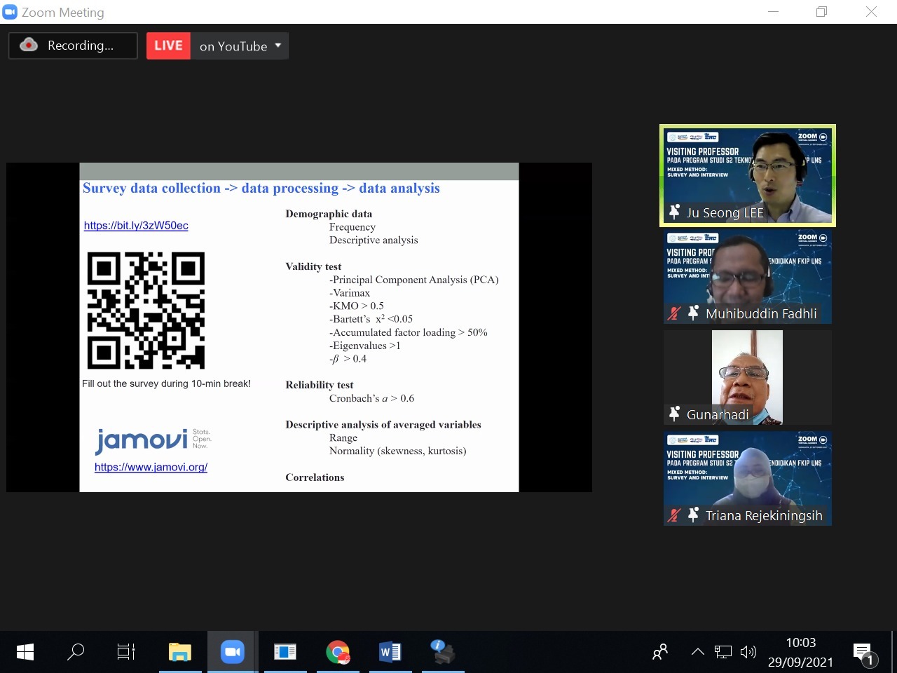 Prof. Lee menggunakan aplikasi Jamovi untuk analisis data kuantitatif. Beliau mengatakan bahwa aplikasi ini gratis dan dan sangat mudah penggunaannya. Selain itu peserta juga mendapatkan beberapa materi dan artikel Prof. Lee secara gratis yang terbit di jurnal-jurnal internasional bereputasi.