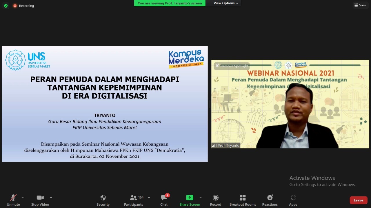 FKIP—The Student Association of the Pancasila and Citizenship Education Study Program (HMP) held a National Seminar on National Insights 2021 on Tuesday (2/11/2021) online via the Zoom Meeting application. With the theme “The Role of Youth in Facing Leadership Challenges in the Digital Age”, the seminar was officially opened by the Deputy Dean for Academic, Research, and Student Affairs FKIP UNS, Prof. Dr. Slamet Subiyantoro, M.Si.