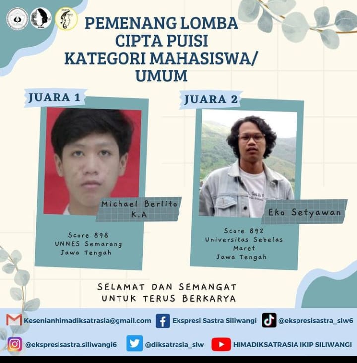 Kegiatan Ekspresi Sastra Siliwangi merupakan kegiatan tahunan yang diselenggarakan Himpunan Mahasiswa Pendidikan Bahasa dan Sastra Indonesia (PBSI) Institut Keguruan dan Ilmu Pendidikan (IKIP) Siliwangi, Bandung. Tahapan lomba diantaranya adalah administrasi, pengumpulan, penjurian, dan pengumuman pemenang. Pada pengumuman hari Sabtu (27/11/2021) di akun Instagram @ekspresisastra.siliwangi, Eko Setyawan berhasil meraih dua juara sekaligus.
