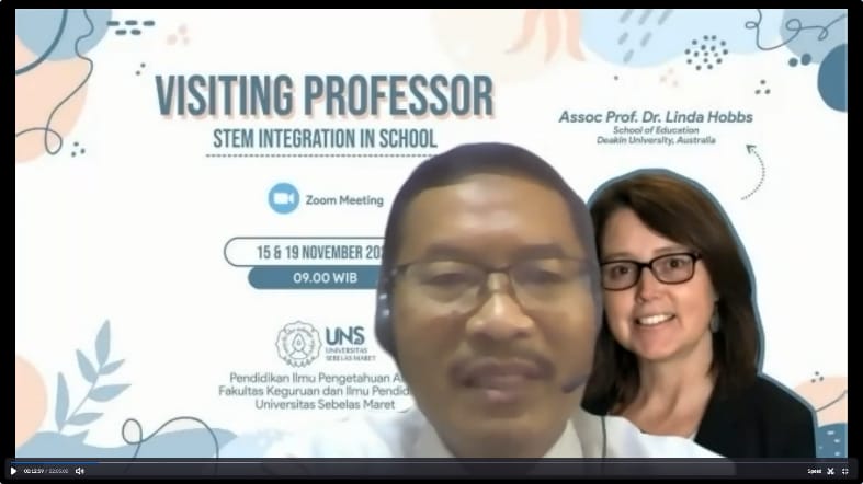 FKIP – Program Studi (Prodi) Pendidikan IPA Fakultas Keguruan dan Ilmu Pendidikan (FKIP) Universitas Sebelas Maret (UNS) Surakarta mendatangkan Profesor luar negeri dalam rangka Visiting Professor dengan tema “STEM Integration in School”. Kegiatan secara online melalui platform Zoom Meeting ini dilaksanakan selama dua hari pada tanggal 15 dan 19 November 2021. Adapun Profesor tersebut adalah Assoc. Prof. Dr. Linda Hobbs seorang pengajar dan ahli STEM Teaching & Learning dari School of Education, Deakin University, Australia.