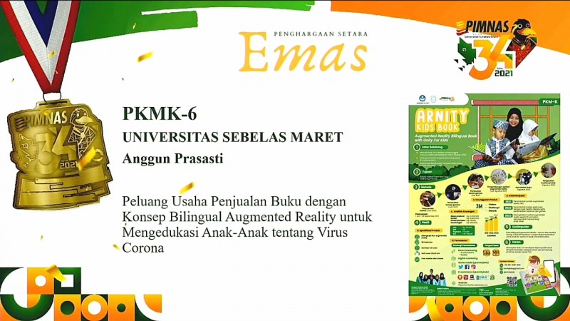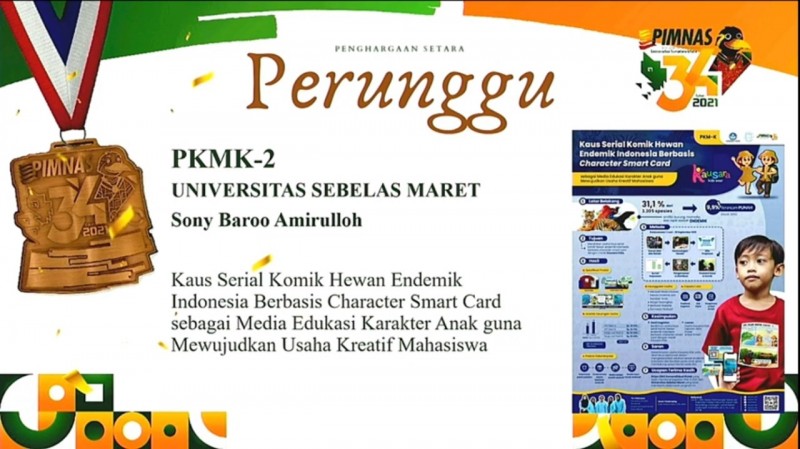 Untuk medali emas kategori poster, diperoleh Tim Program Kreativitas Mahasiswa-Kewirausahaan (PKM-K) yang diketuai oleh Sony Baroo Amirulloh dengan judul “Kaus Serial Komik Hewan Endemik Indonesia Berbasis Character Smart Card Sebagai Media Edukasi Karakter Anak Guna Mewujudkan Usaha Kreatif Mahasiswa”.