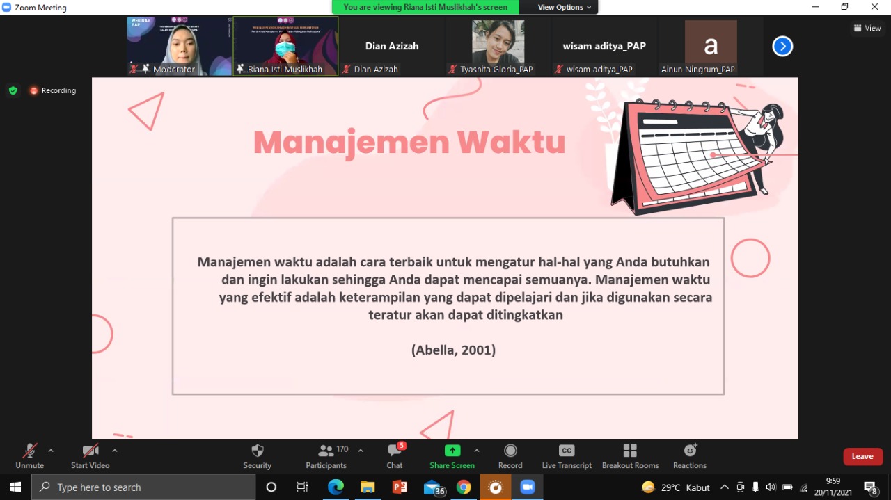 Selanjutnya pemaparan oleh Riana Isti Muslikhah, M.Pd. yakni seorang dosen di Universitas Negeri Yogyakarta (UNY). Riana memaparkan materi dengan tajuk “Manajemen Waktu bagi Mahasiswa”. Riana mengawali dengan menyampaikan pengertian dari manajemen waktu.