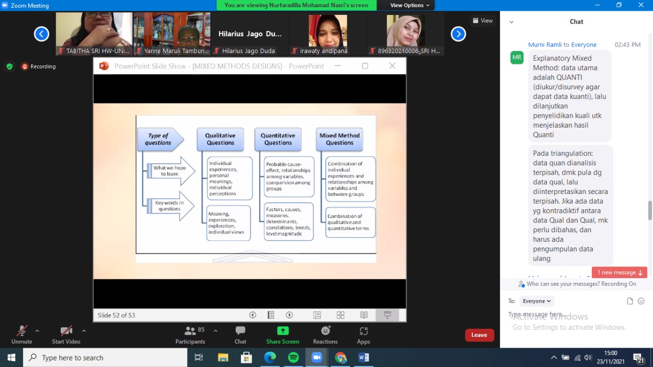 Pada sesi kedua, Dr. Nurfaradilla lebih menekankan pada metode yang digunakan dalam penelitian mix method. Menurut Dr. Nurfaradilla, penelitian mix method cenderung lebih membutuhkan waktu yang banyak dikarenakan peneliti harus meyakinkan bahwa data yang didapat sudah valid pada kedua jenis data, baik pada data kuantitatif maupun data kualitatif.