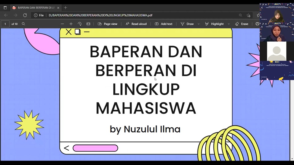 Pembicara pertama, Nuzulul Ilma yang merupakan Alehra Research Project for BPJS Keenagakerjaan. Pada kesempatan kali ini, Ilma menyampaikan materi dengan tajuk “Baperan dan Berperan di Lingkup Mahasiswa”.