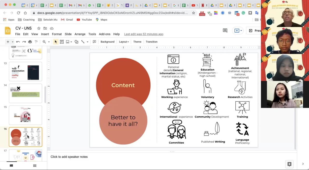 At the end of the presentation, Irvandias emphasized that he should pay more attention to the content that will be included in the CV rather than thinking about how the design is used.