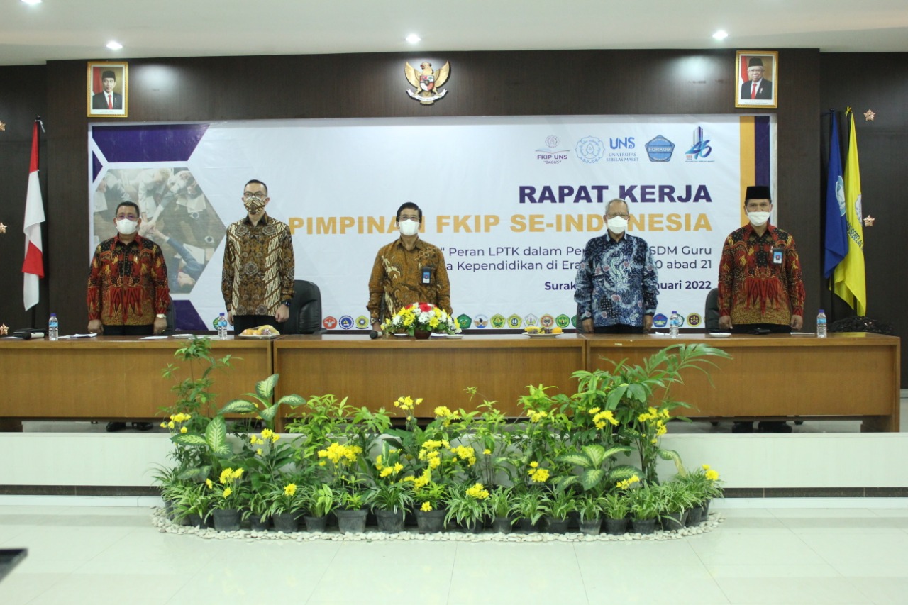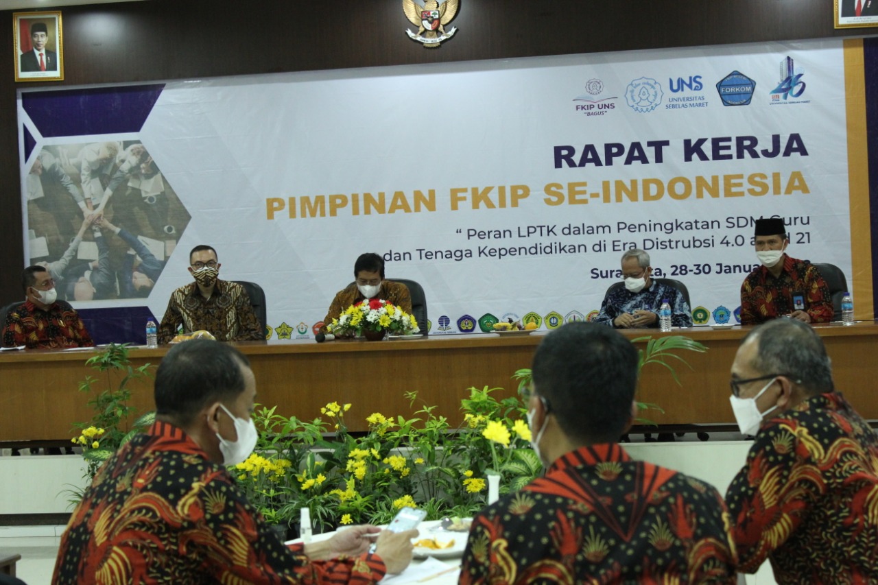 FKIP — Rapat Kerja Pimpinan Fakultas Keguruan dan Ilmu Pendidikan (FKIP) Negeri se-Indonesia dengan tema “Peran LPTK dalam meningkatkan SDM Guru dan Tenaga Kependidikan di Era Distrupsi 4.0 Abad ke-21” secara resmi dibuka. Pembukaan tersebut dilakukan oleh Rektor UNS, Prof. Jamal Wiwoho yang dilaksanakan secara luring di UNS Inn dan daring melalui Zoom Meeting pada Sabtu (29/1/2022).