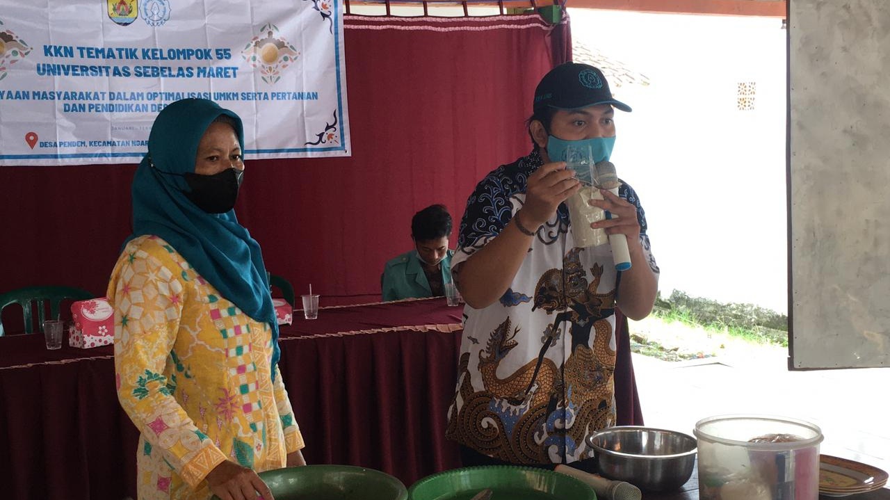 FKIP – Mahasiswa peserta Kuliah Kerja Nyata (KKN) Universitas Sebelas Maret (UNS) yang tergabung dalam Kelompok 55 memberikan dampak positif bagi masyarakat di Desa Pendem, Ngaringan, Grobogan, Jawa Tengah dengan menggelar kegiatan pengembangan pasar tradisional dan pertanian. Kegiatan tersebut tersusun atas tiga rangkaian, yaitu Pelatihan Pembuatan Getuk Isi, Pelatihan Pembuatan Tempe dari Kacang Hijau, serta Pelatihan Pembuatan Pupuk Kompos dan Pestisida Alami.