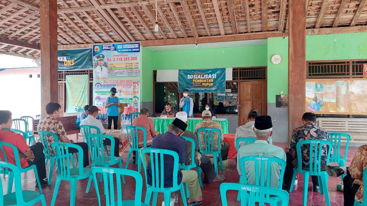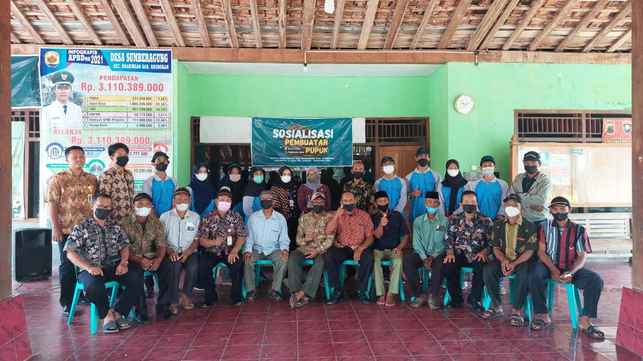 Sosialisasi pembuatan pupuk organik tersebut melibatkan Perangkat Desa dan Kelompok Tani Desa Sumberagung serta seorang dosen pembantu lapangan, yaitu Sorja Koesuma, S.Si., M.Si. Adapun, bahan-bahan yang digunakan untuk pupuk organik adalah jerami, sekam, bekatul, gula, air, dan larutan efektif mikroorganisme 4 (EM4).