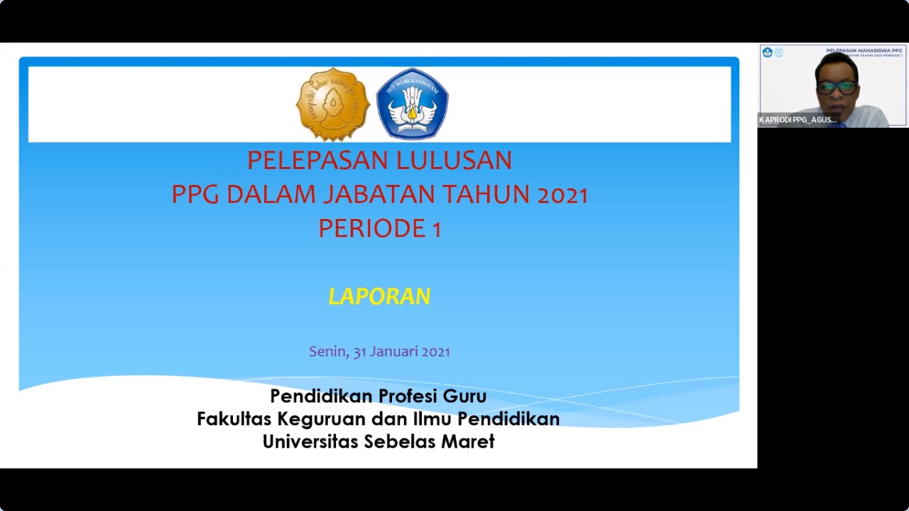FKIP – Program Studi Pendidikan Profesi Guru (PPG) Fakultas Keguruan dan Ilmu Pendidikan (FKIP) Universitas Sebelas Maret (UNS) Surakarta melepas mahasiswa PPG dalam jabatan secara daring melalui Zoom Cloud Meeting pada Senin (31/1/2022).