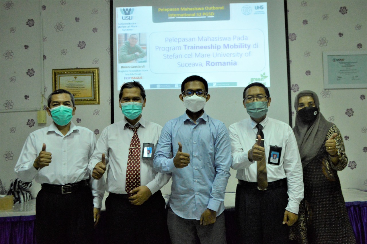FKIP – Pelepasan Mahasiswa Program Magister (S-2) Pendidikan Guru dan Sekolah Dasar (PGSD). Fakultas Keguruan dan Ilmu Pendidikan (FKIP) Universitas Sebelas Maret (UNS) Surakarta, Rivan Gestiardi, untuk menempuh Program Traineeship Mobility di Stefan Cel Mare University of Suceava, Romania berlangsung di Ruang Sidang I Gedung F FKIP UNS pada Jumat (4/2/2022). Pelepasan tersebut dilakukan oleh Dekan FKIP. UNS, Dr. Mardiyana, M.Si., Wakil Dekan Bidang Akademik, Riset dan Kemahasiswaan FKIP UNS, Prof. Dr. Slamet Subiyantoro, M.Si., Kepala Program Studi (Kaprodi) Magister PGSD FKIP UNS, Dr. Riyadi, M.Si., serta dosen pendamping, Dr. Sri Marmoah, M.Pd.