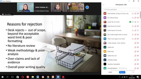 FKIP – Masters (S-2) English Education Faculty of Teacher Training and Education (FKIP) Universitas Sebelas Maret (UNS) Surakarta held a webinar on writing and publishing journal articles on Thursday (28/4/2022). Themed “Writing for Publication in Language and Literacy Education: Editor’s Voice”, the activity was held online through the Zoom Meeting application.