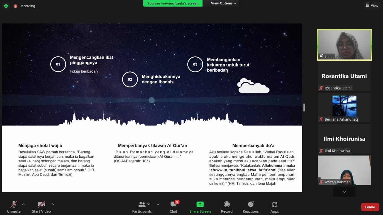 Laela closed her presentation by explaining how to find or get the night of lailatul qadar. He mentioned that there are 3 ways to get it, namely focusing on worship, living it with worship, and waking the family to join in worship.
