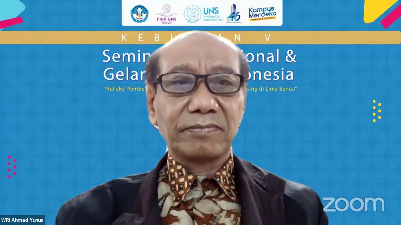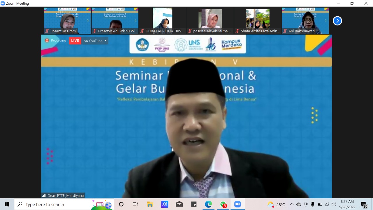 FKIP – Fakultas Keguruan dan Ilmu Pendidikan (FKIP) Universitas Sebelas Maret (UNS) Surakarta menggelar Seminar Kebipaan V yang merupakan Seminar Internasional & Gelar Budaya Indonesia pada Sabtu (28/5/2022). Bertemakan “Refleksi Pembelajaran Bahasa Indonesia bagi Penutur Asing di Lima Benua”, seminar digelar secara daring melalui aplikasi Zoom Meeting dan siaran langsung pada akun YouTube M Rohmadi Ratulisa.