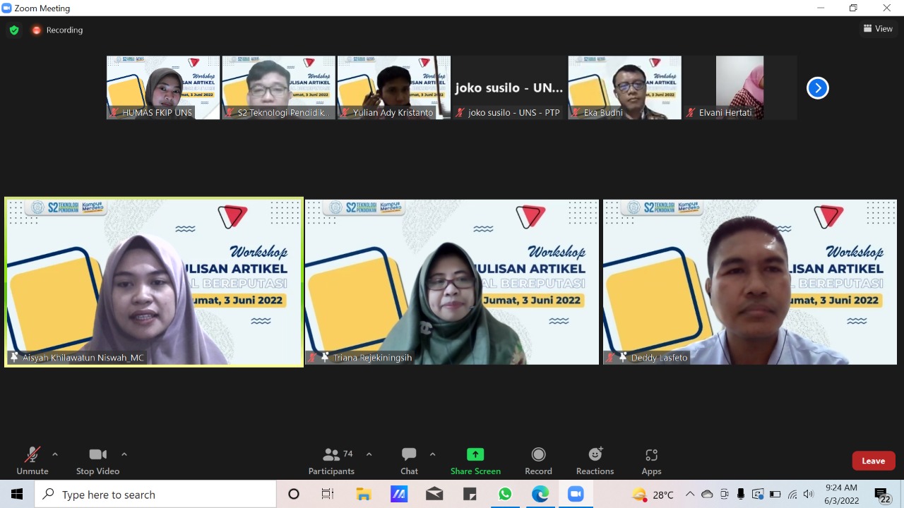 FKIP – Masters Study Program (S-2) Educational Technology (TP) Faculty of Teacher Training and Education (FKIP) Sebelas Maret University (UNS) Surakarta held a Reputable Journal Article Writing Workshop on Friday (3/6/2022). The workshop was held online through the Zoom Meeting application.