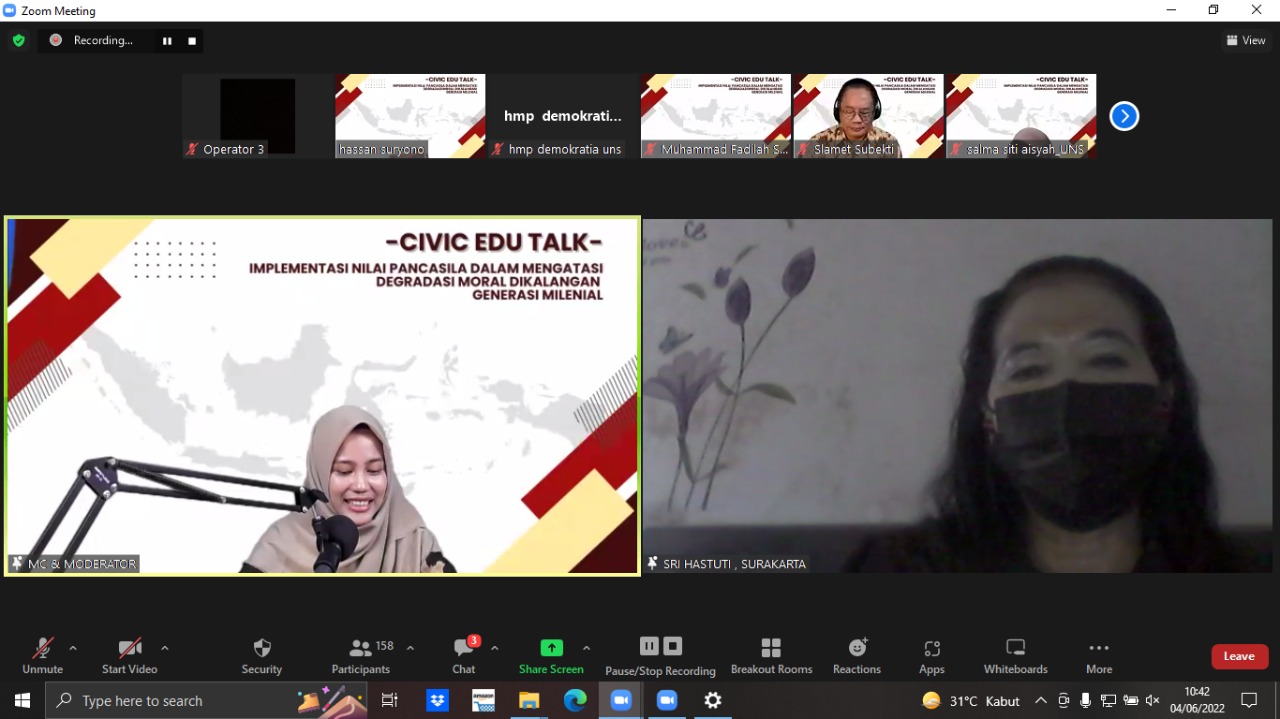 FKIP – Himpunan Mahasiswa Program Studi Pendidikan Pancasila dan Kewarganegaraan (HMP PPKn Demokratia) Fakultas Keguruan dan Ilmu Pendidikan (FKIP) Universitas Sebelas Maret (UNS) Surakarta menggelar diskusi bertajuk “Civic Edu Talk” pada Sabtu (4/6/2022). Mengusung tema “Implementasi Nilai Pancasila dalam Mengatasi Degradasi Moral di Kalangan Generasi Milenial”, webinar digelar secara daring melalui aplikasi Zoom Meeting.