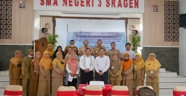 FKIP – The Citizenship Political Philosophy Research Group (Prodi) Pancasila and Citizenship Education (PPKn) Faculty of Teacher Training and Education (FKIP) Sebelas Maret University (UNS) Surakarta conducted community service activities entitled “Training and Assistance in the Development of Civic Education Learning Materials on the Study of the Constitution 1945 Based on the Decision of the Constitutional Court” on Monday (23/5/2022) at SMAN 3 Sragen.