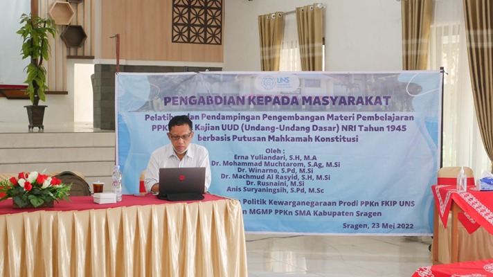 This activity was carried out through a collaboration between the PPKn Study Program, FKIP UNS, and the MGMP PPKn SMA Sragen Regency. The reason for implementing this activity is because Civics teachers generally only use textbooks for teaching the 1945 Constitution, even though the Constitutional Court’s decision can be used as teaching material for the 1945 Constitution.