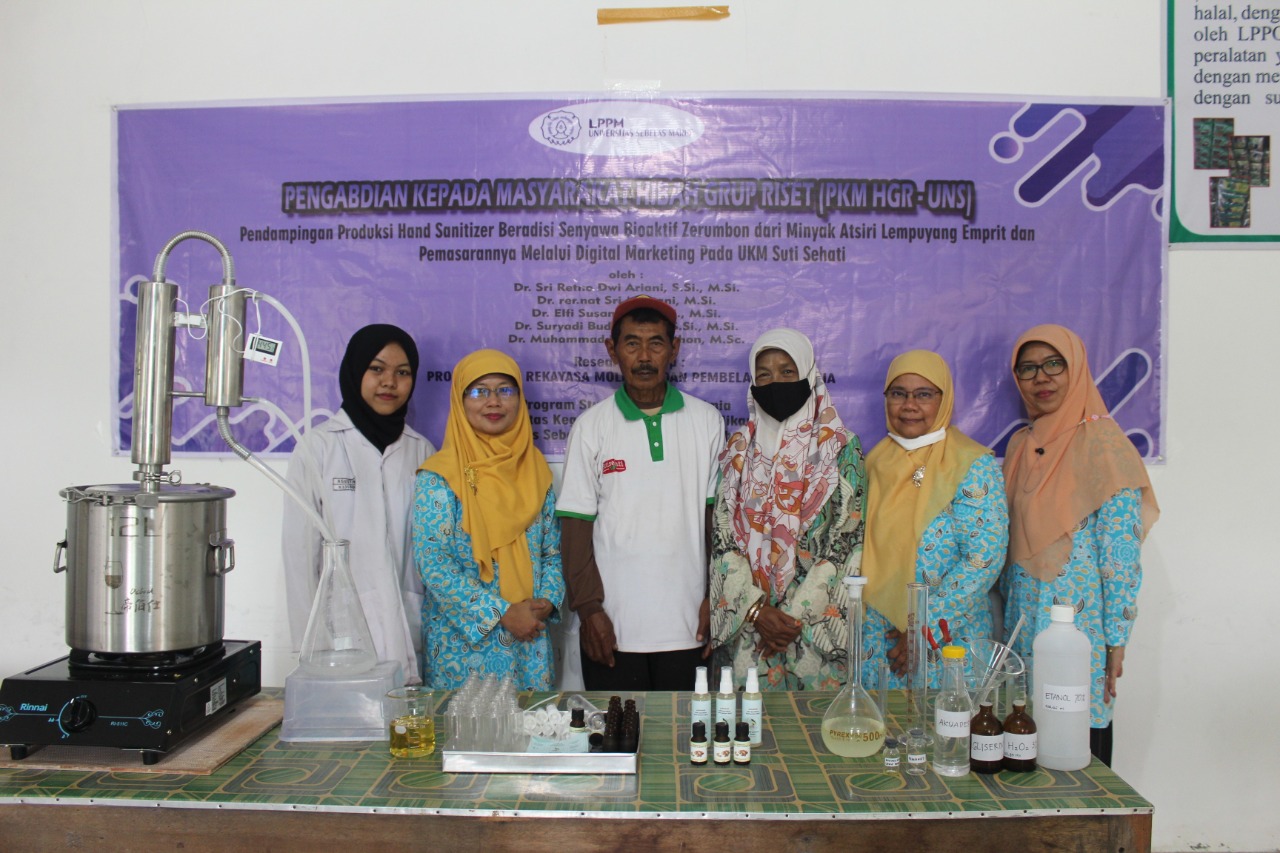 FKIP – Community Service Team Natural Products Research Group, Molecular Engineering, and Chemistry Learning The Chemical Education Study Program of the Teacher Training and Education Faculty (FKIP) Sebelas Maret University (UNS) Surakarta carried out assistance in the production of hand sanitizers containing the bioactive compound zerumbon from lempuyang emprit essential oil and marketing it through digital marketing.
