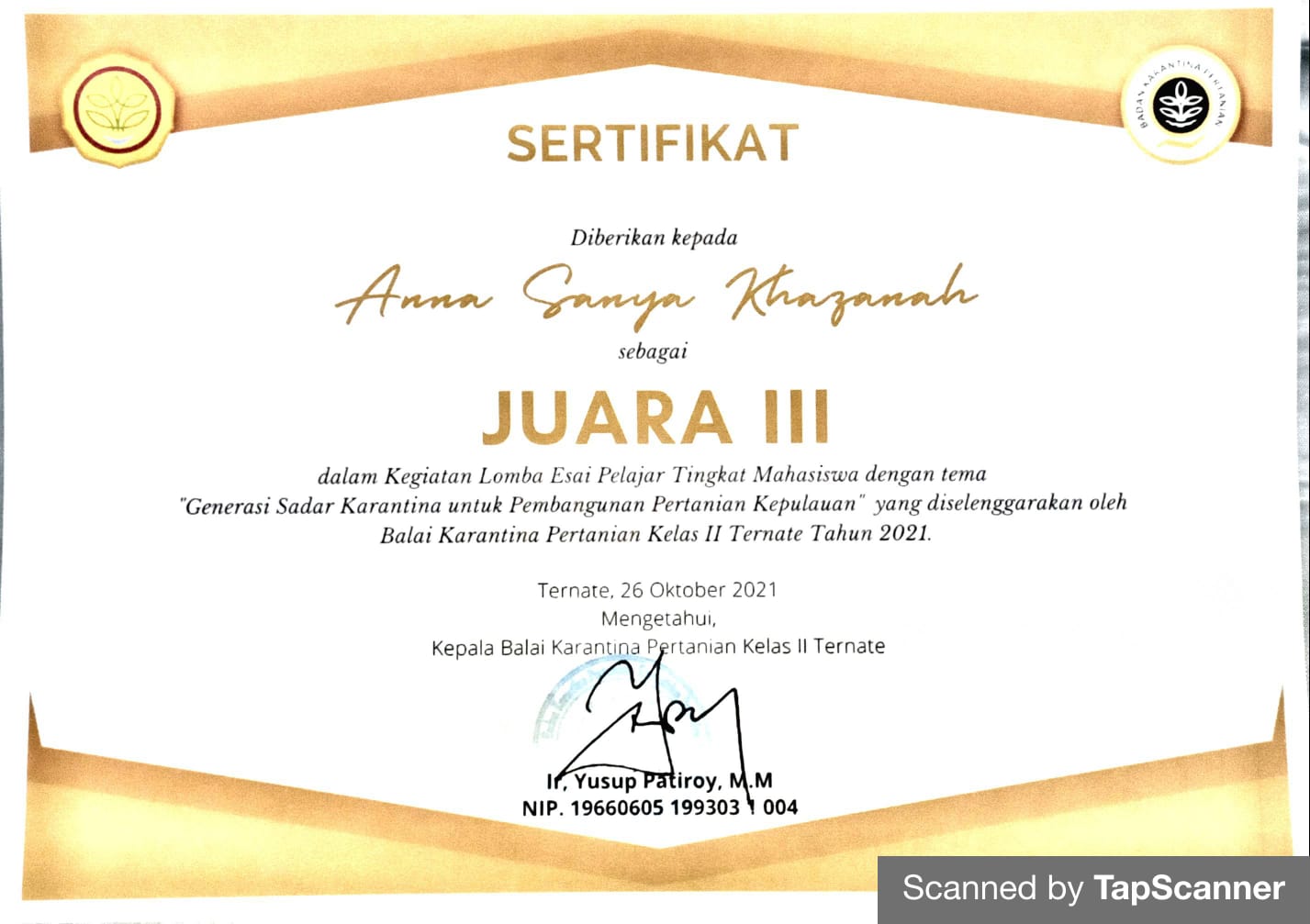 Lomba esai tingkat mahasiswa dengan tema “Generasi Sadar Karantina untuk Pembangunan Pertanian Kepulauan” ini diselenggarakan oleh Balai Karantina Pertanian Ternate 2021. Adapun tahapan perlombaan terdiri dari pendaftaran dan pengumpulan karya tanggal 5-22 Oktober 2021, penjurian tanggal 23 – 25 Oktober 2021, dan pengumuman pemenang pada tanggal 26 Oktober 2021.