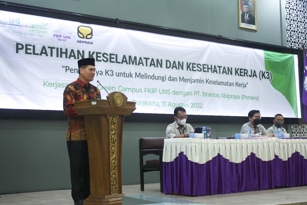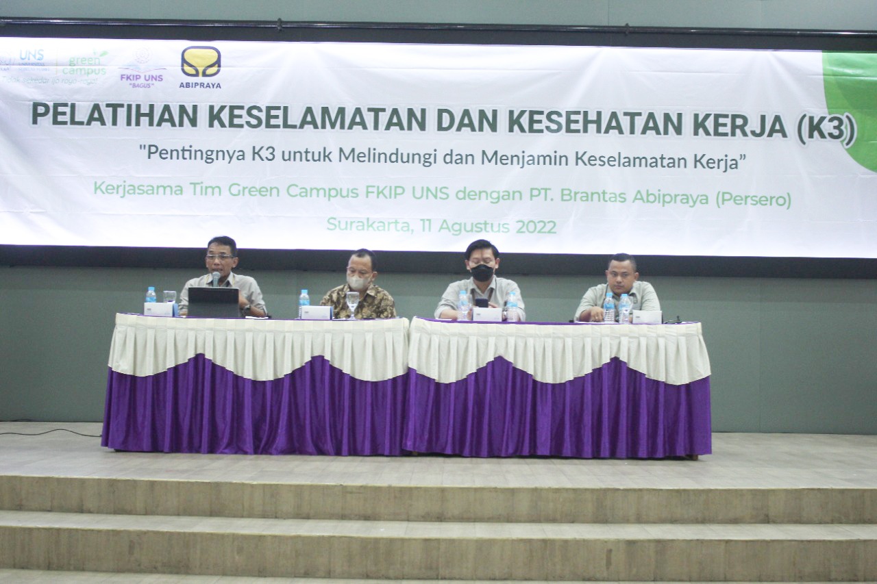 FKIP — The Green Campus Team of the Faculty of Teacher Training and Education (FKIP) Universitas Sebelas Maret (UNS) Surakarta held a collaboration with PT. Brantas Abipraya in the form of Offline Occupational Health and Safety (K3) Training on Thursday (11/8/2022) in the Hall of Building F FKIP UNS. This training activity carries the theme “The Importance of K3 to Protect and Ensure Work Safety”.