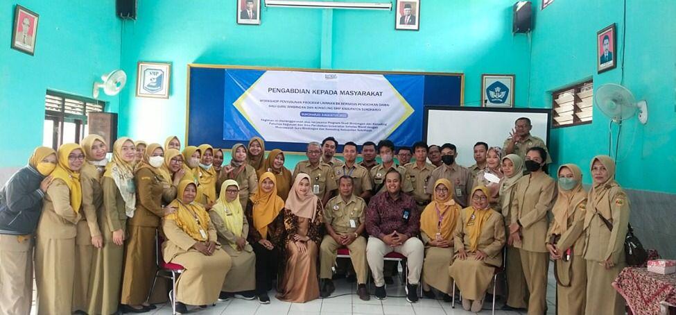 HUMAS FKIP – Tim Pengabdian kepada Masyarakat Program Studi (Prodi) Bimbingan dan Konseling (BK) Fakultas Keguruan dan Ilmu Pendidikan (FKIP) Universitas Sebelas Maret (UNS) Surakarta yang tergabung dalam Grup Riset Manajemen, Psikoedukasi dan Konseling menyelenggarakan kegiatan lokakarya di Aula Sekolah Menengah Pertama Negeri (SMPN) 2 Sukoharjo. Lokakarya bertajuk “Penyusunan Program Layanan BK Berbasis Pendidikan Damai bagi Guru BK SMP Kabupaten Sukoharjo” dilaksanakan pada Selasa (9/8/2022). Kegiatan ini bekerja sama dengan Musyawarah Guru Bimbingan dan Konseling (MGBK) SMP Kabupaten Sukoharjo.