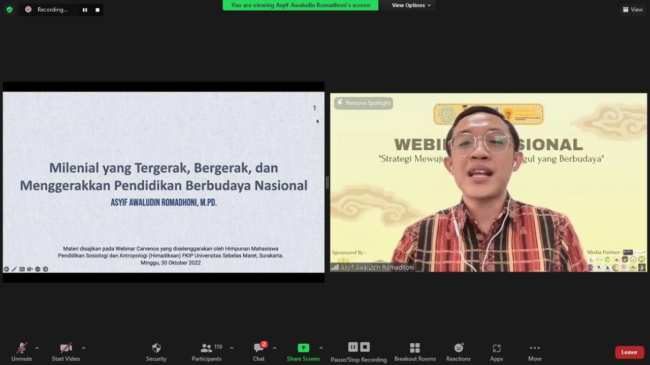 FKIP — Carving Event Sociology or commonly known as Carvenos 2022 held a national webinar with the theme “Strategy for Creating a Cultured Superior Generation”. The event, which was attended by high school/Madrasal Aliyah (SMA/MA) students throughout Indonesia, was held online via Zoom Meeting on Sunday (10/30/2022). The webinar hosted by Seli Karisma presented Berlian Verlino as the 1st winner of Mas Central Java 2019 and Asyif Awaludin Romadhoni as the Central Java Language Ambassador as speakers.