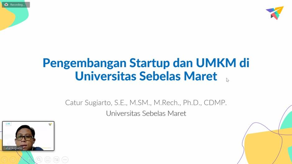 Pembicara yang kedua adalah Catur Sugiarto, S.E., M.S.M., Ph.D., C.D.M.P. Ia merupakan Kepala Divisi Startup dan Inkubasi Direktorat Inovasi dan Hilirisasi UNS. Ia memaparkan materi bertajuk “Pengembangan Startup dan UMKM di Universitas Sebelas Maret”. Dalam materi tersebut ia menjelaskan materi mulai contoh inkubator dan akselerator di Indonesia, pengenalan UNS Innovation Hub, gambaran umum program Semesta Bright UNS, hingga tahapannya.