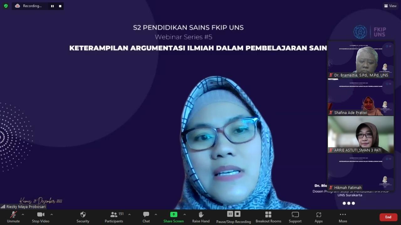 FKIP – Program Studi (Prodi) Magister (S-2) Pendidikan Sains Fakultas Keguruan dan Ilmu Pendidikan (FKIP) Universitas Sebelas Maret (UNS) Surakarta menggelar acara Webinar Series #5 bertema “Keterampilan Argumentasi Ilmiah dalam Pembelajaran Sains”. Webinar ini dilaksanakan pada Kamis (29/12/2022) secara daring melalui aplikasi Zoom Meeting.