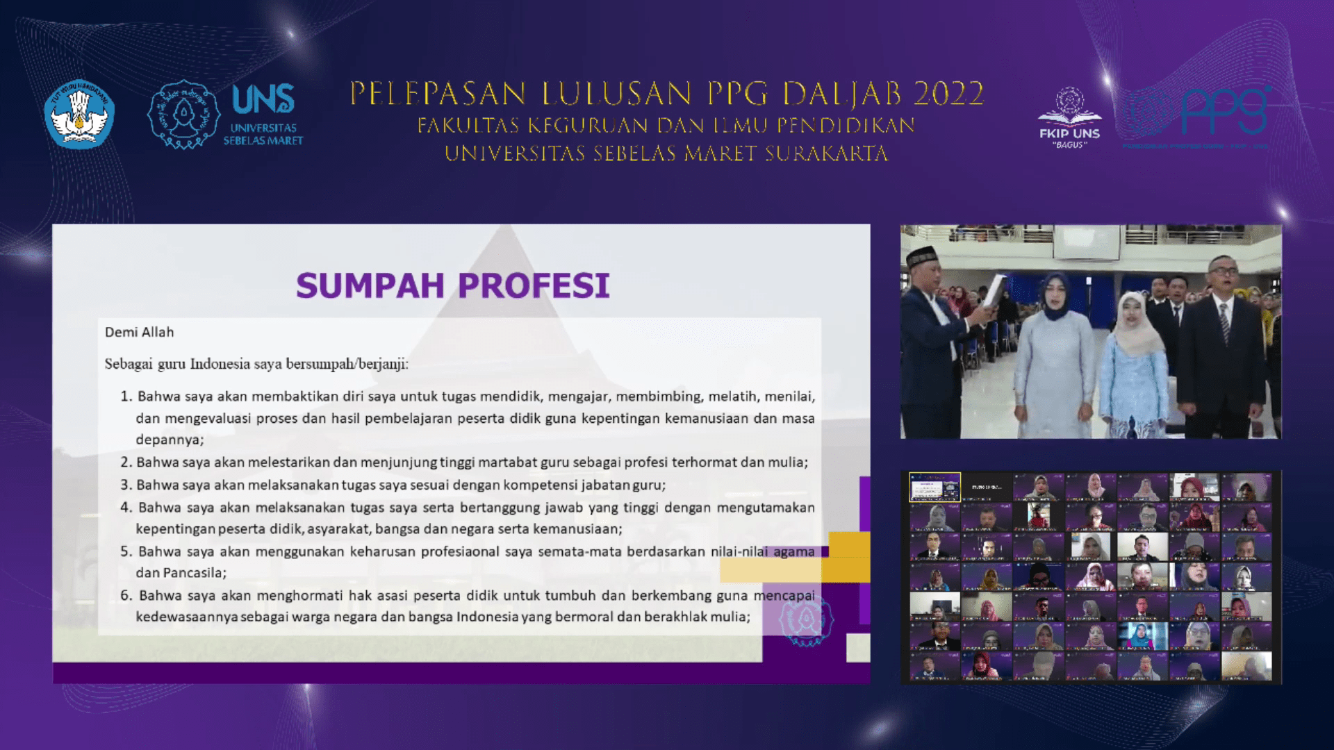FKIP – Teacher Professional Education (PPG) Study Program, Faculty of Teacher Training and Education (FKIP) Sebelas Maret University (UNS) Surakarta held a Graduation Ceremony for PPG Students in the Service Batch of 2022 on Tuesday (1/3/2023). The release was held offline in the Hall of Building F FKIP UNS, online via the Zoom Meeting application, and broadcast live via the Semar TV Youtube account.