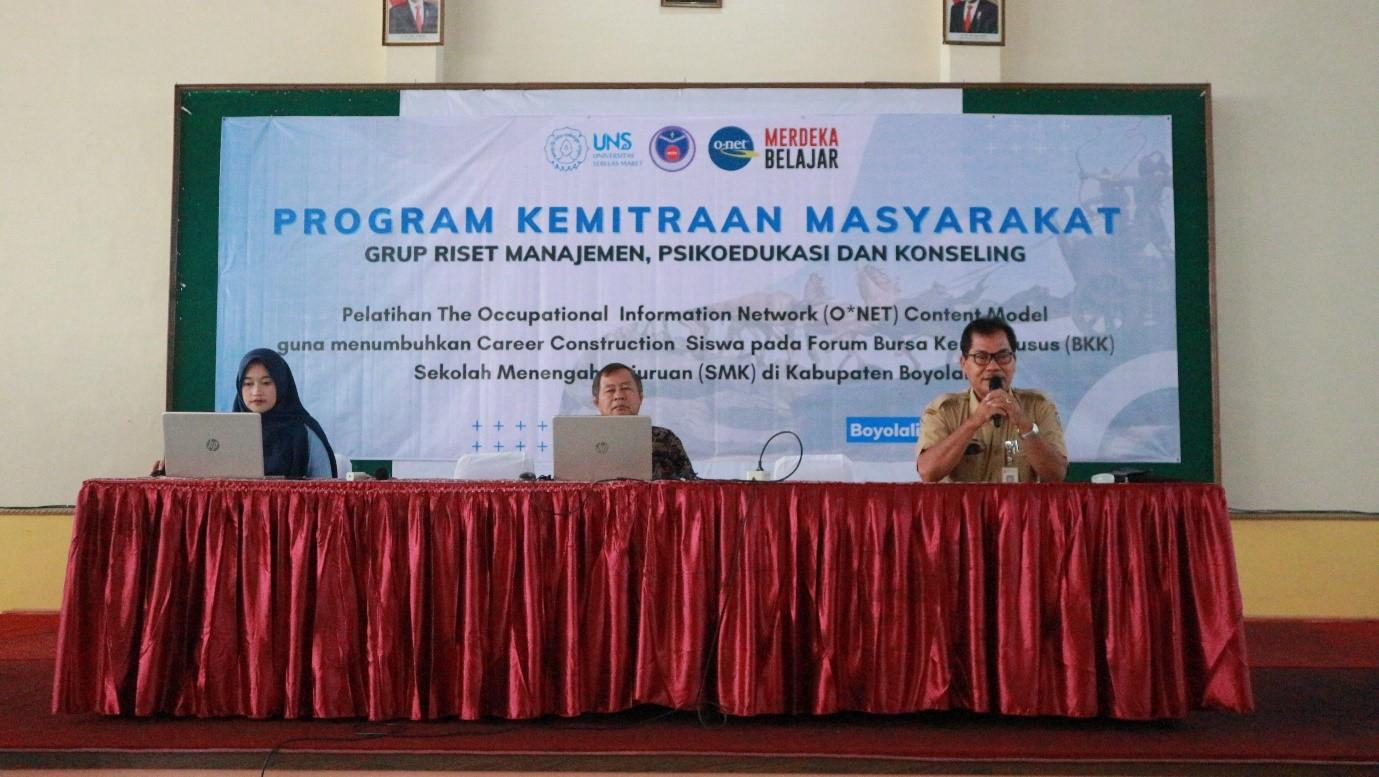 PKM is an activity that aims to solve problems faced by target partners. The PKM activity carried out by the RG Management, Psychoeducation, and Counseling Team was a training entitled “The Occupational Information Network (O*NET) Content Model to Grow Student Career Construction at the Vocational Special Job Exchange Forum (BKK) for Vocational Schools in Boyolali Regency”.