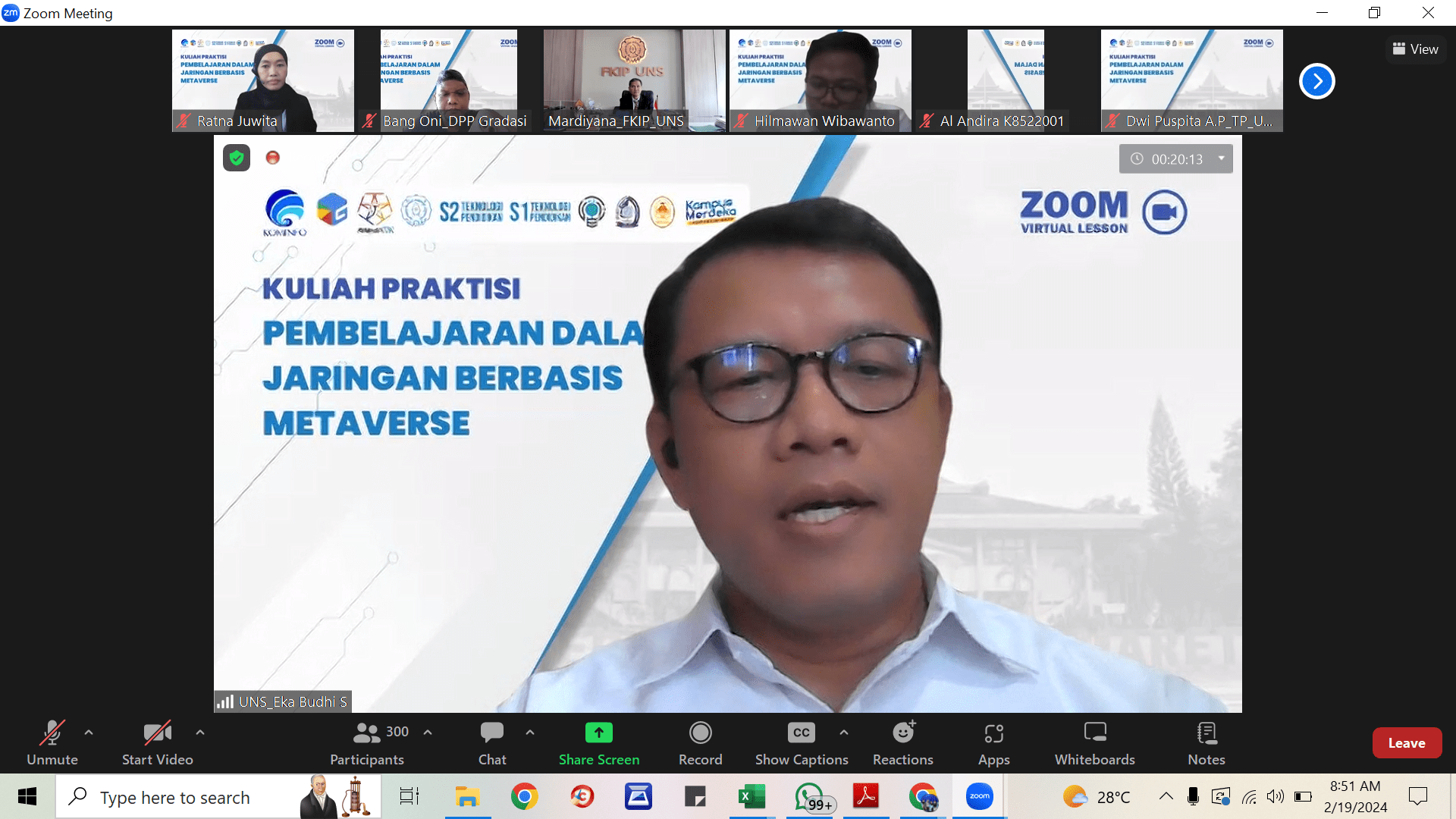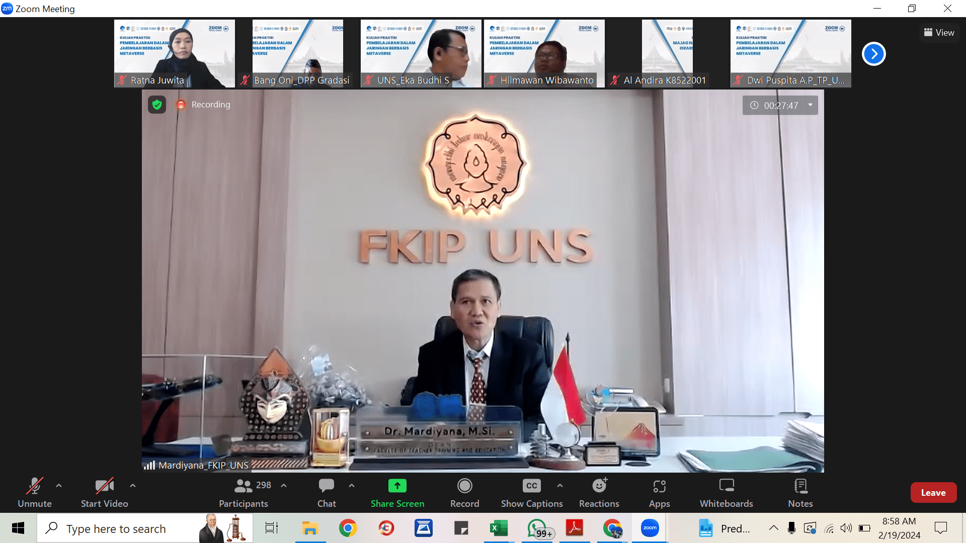 FKIP – Fakultas Keguruan dan Ilmu Pendidikan (FKIP) Universitas Sebelas Maret (UNS) Surakarta menggelar Kuliah Praktisi Pembelajaran Daring Berbasis Metaverse pada Senin (19/2/2024) secara daring melalui aplikasi Zoom Meeting. Kegiatan ini merupakan kolaborasi bersama Direktur Pemberdayaan Informatika Direktur Jenderal Aplikasi Informatika (Dirjen Aptika) Kementerian Komunikasi dan Informatika Republik Indonesia (Kemkominfo RI) dan Dewan Pimpinan Daerah (DPD) Generasi Digital Indonesia (Gradasi).