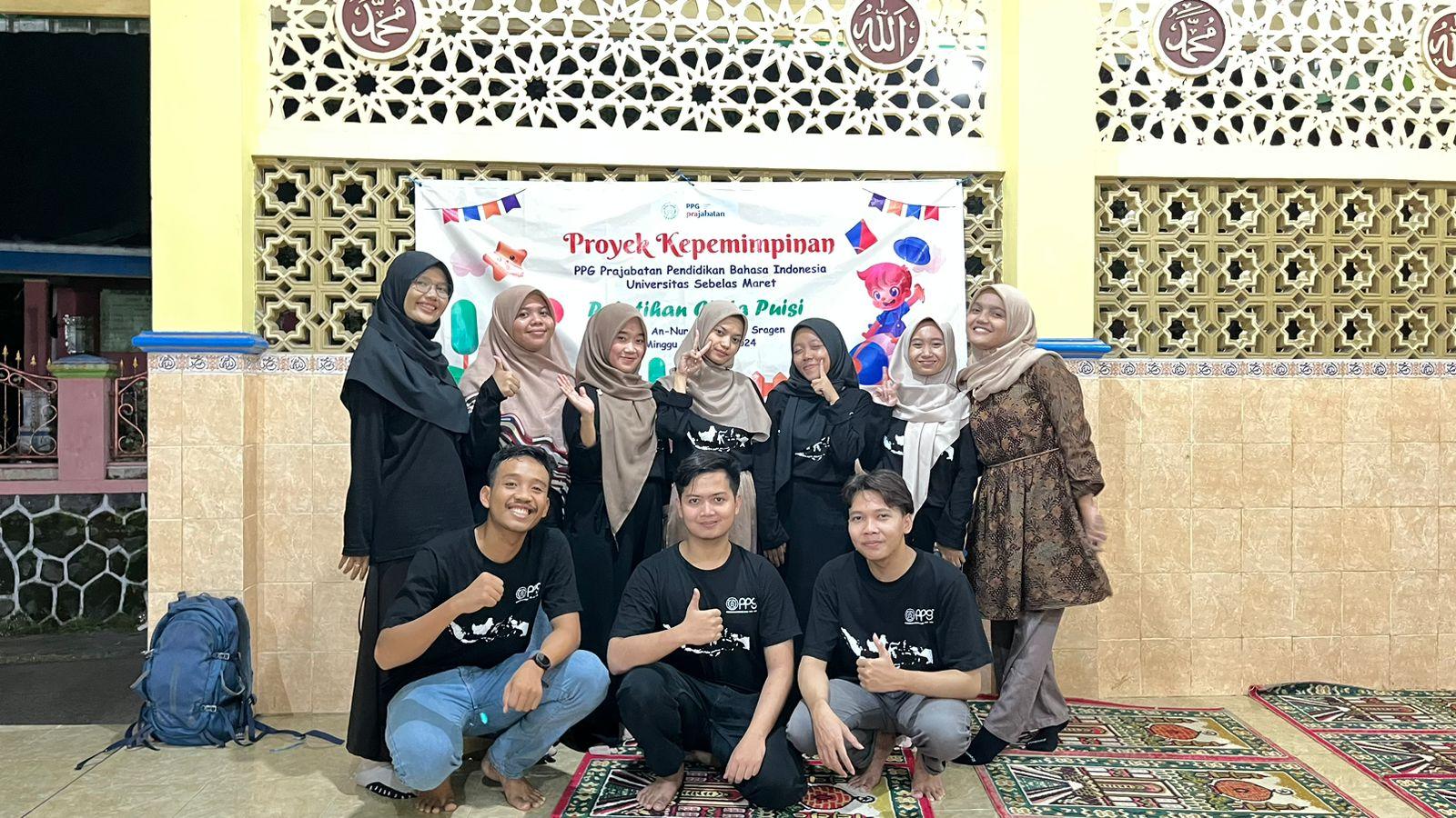 FKIP – Tim Mahasiswa Program Studi (Prodi) Pendidikan Profesi Guru (PPG) Prajabatan Gelombang 1 Tahun 2023 mengimplementasikan Proyek Kepemimpinan II dengan menggelar Lokakarya Keterampilan Menulis Puisi dan Menggambar. Lokakarya tersebut digelar di Masjid An-Nur, Tegalombo, Kalijambe, Sragen pada Minggu (31/3/2024).