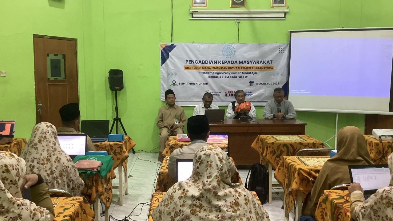 FKIP – Dalam rangka melaksanakan tri Dharma perguruan tinggi dengan kegiatan pengabdian kepada masyarakat, Riset Grup (RG) Manajemen dan Inovasi Pembelajaran Fisika (MIPF) Program Studi Pendidikan Fisika FKIP UNS mengadakan Pendampingan Penyusunan Modul Ajar berbasis STEM pada Fase D di SMP IT Nur Hidayah Surakarta pada Senin (19/8) lalu. Kegiatan tersebut merupakan salah satu dari sekian rangkaian pengabdian yang dilakukan oleh RG MIPF itu sendiri.
