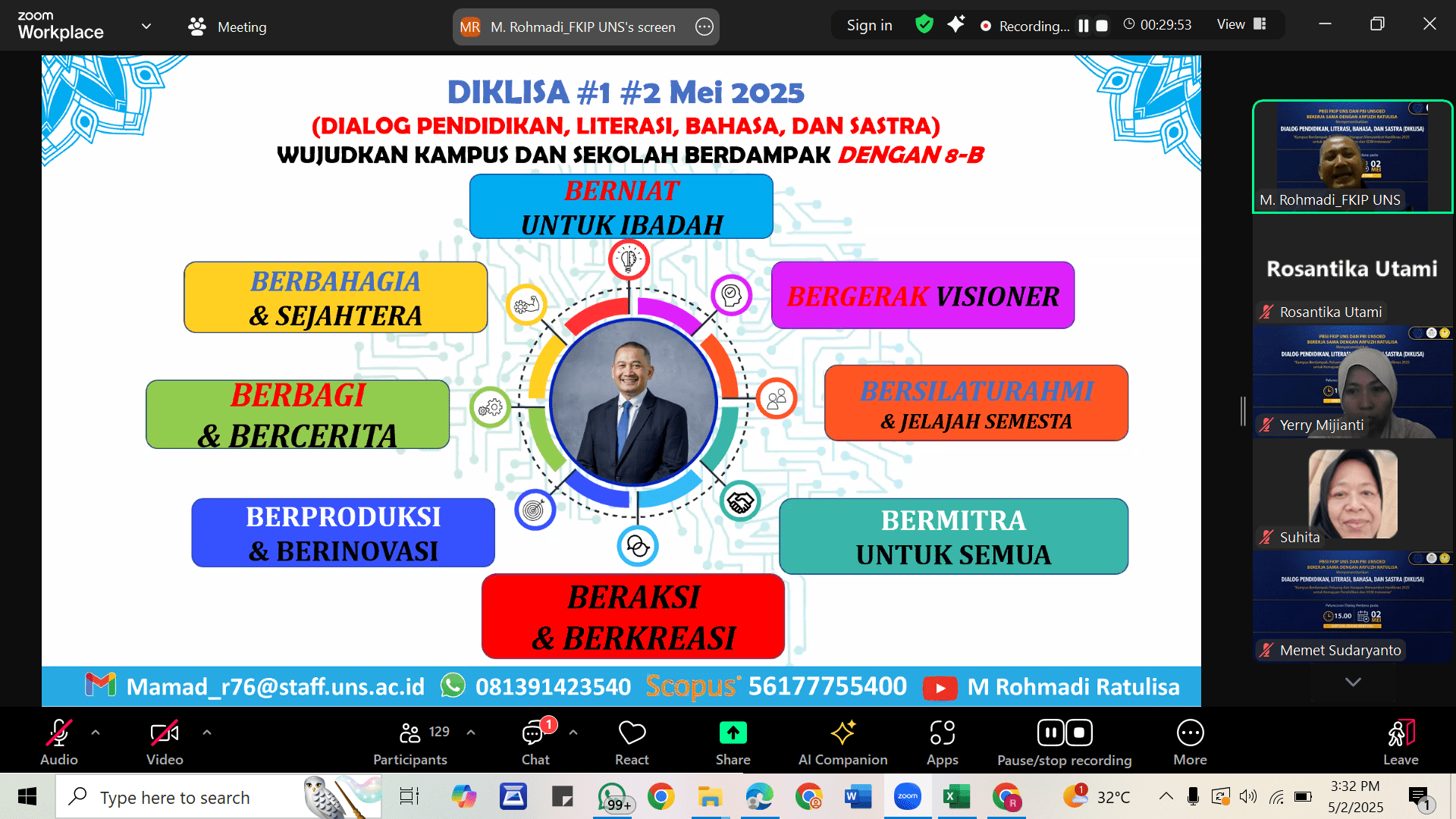 Prof. Rohmadi dalam pemaparannya mengungkapkan konsep 8-B yang dapat menjadi panduan untuk mewujudkan kampus dan sekolah yang berdampak. Dimulai dengan berniat untuk ibadah, beliau menekankan bahwa setiap langkah yang kita ambil harus dimulai dengan niat yang baik, karena niat adalah dasar dari segala tindakan yang bermanfaat. Selanjutnya, bergerak visioner menjadi penting, di mana kita harus memiliki pandangan jauh ke depan dan tidak sekadar mengikuti arus, melainkan menciptakan perubahan yang bermakna. Prof. Rohmadi juga mengingatkan pentingnya bersilaturahmi & jelajah semesta, yang mengajarkan kita untuk terus berhubungan dengan berbagai pihak dan menjelajahi pengetahuan yang ada di sekitar kita.