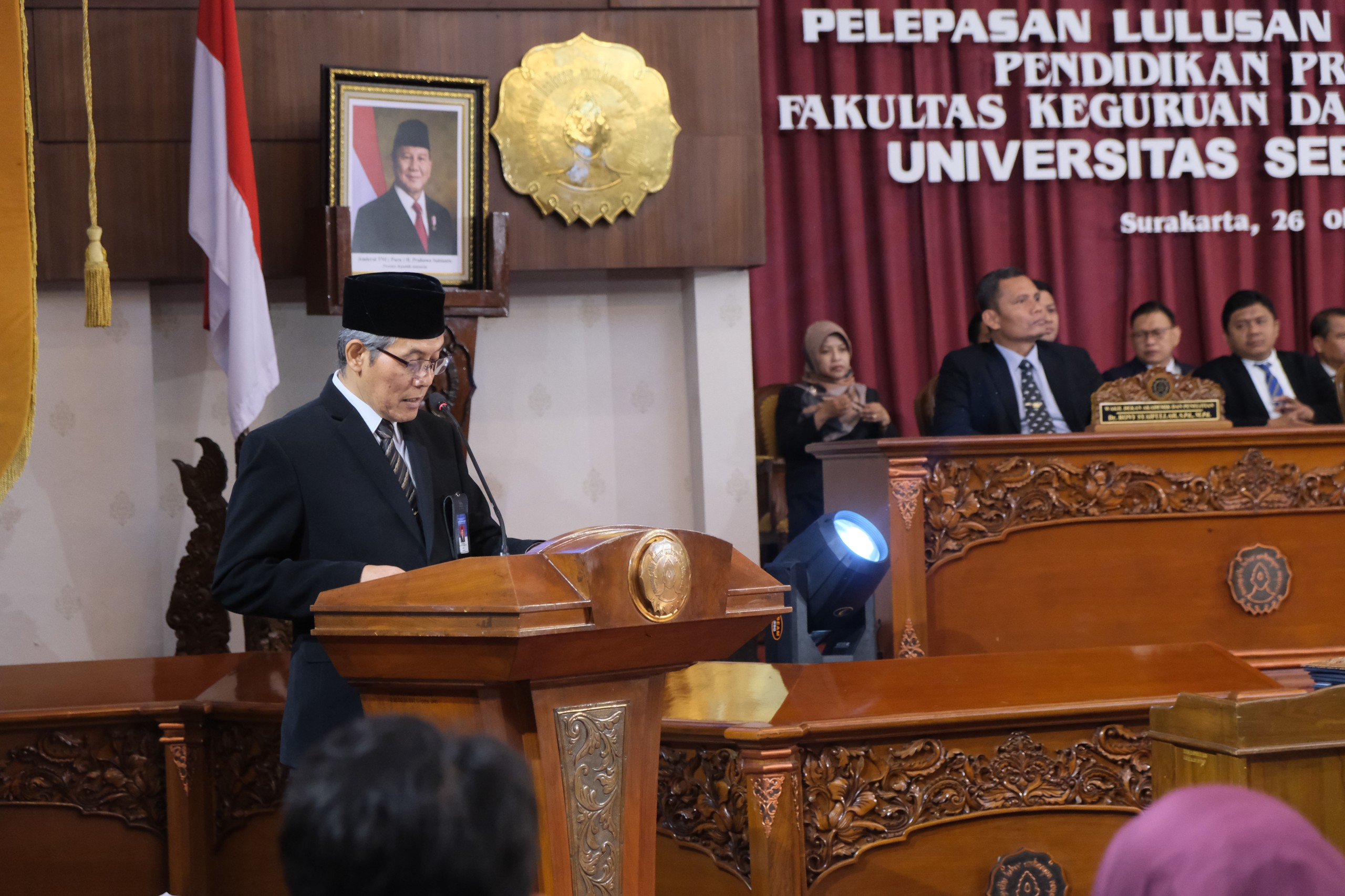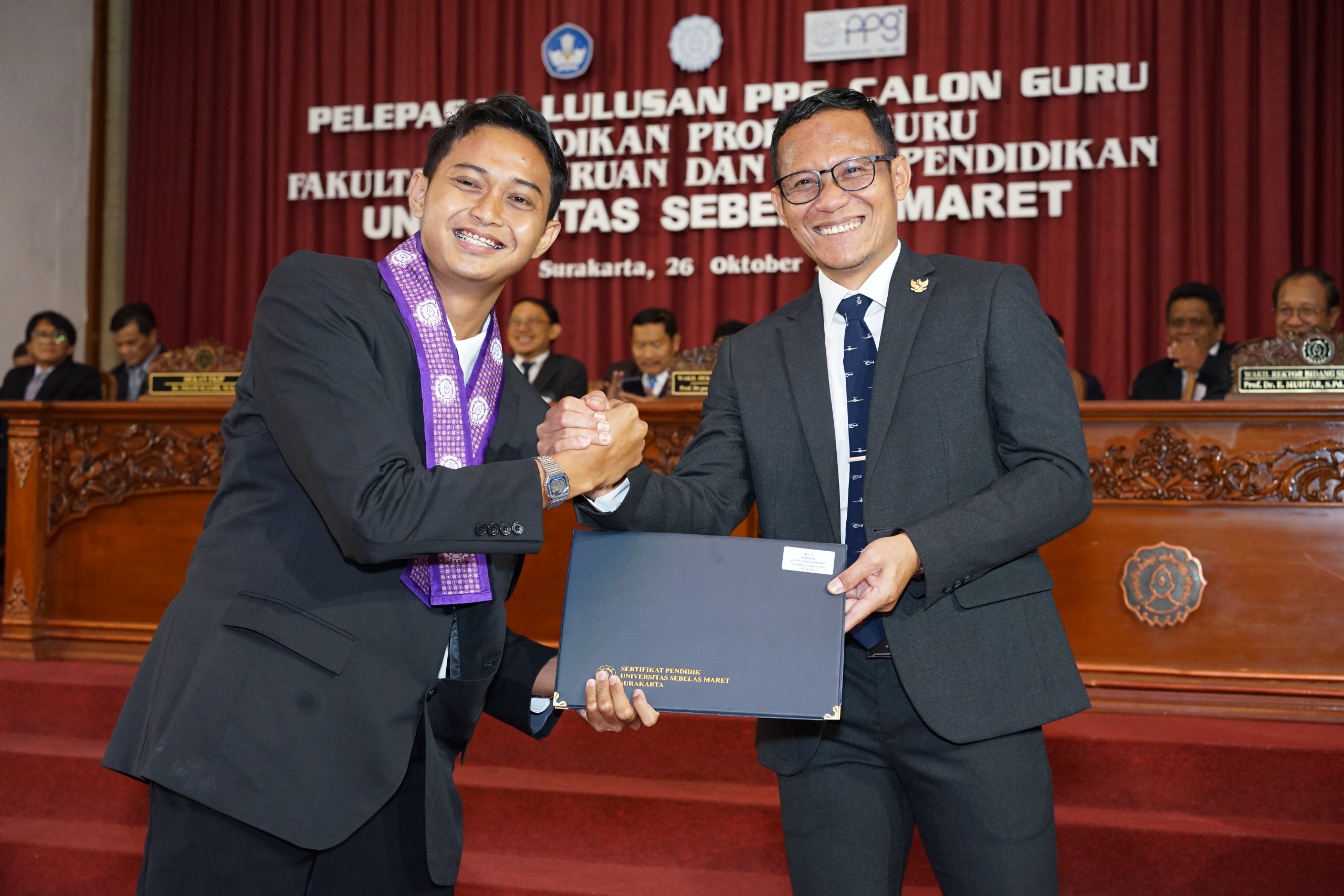Dekan FKIP UNS, Dr. Imam Sujadi, M.Si., menyampaikan selamat kepada para lulusan yang telah menuntaskan seluruh rangkaian Pendidikan Profesi Guru. Ia menegaskan bahwa keberhasilan ini merupakan hasil kerja keras, kedisiplinan, dan semangat pengabdian para calon guru.