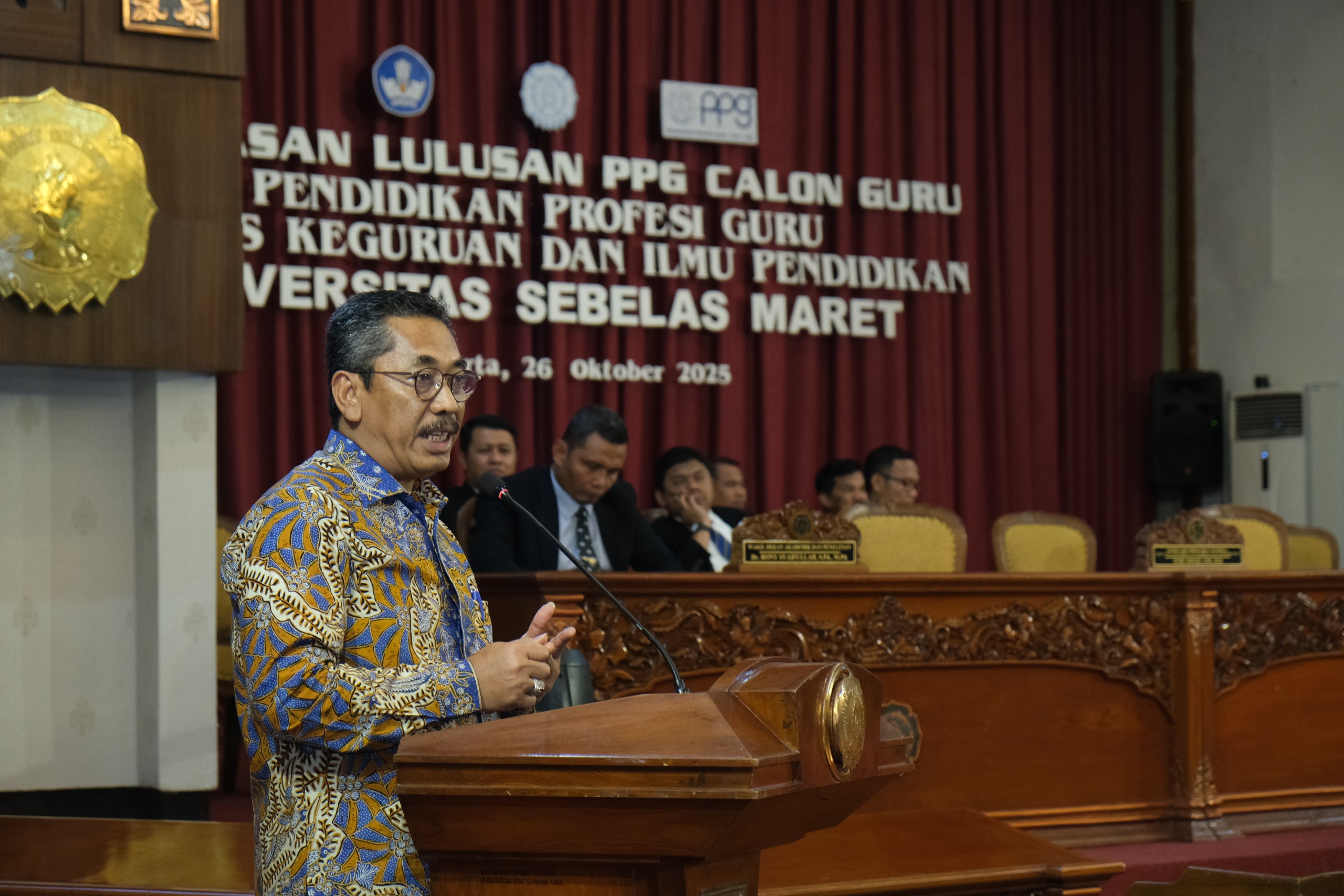 FKIP UNS – Fakultas Keguruan dan Ilmu Pendidikan (FKIP) Universitas Sebelas Maret (UNS) Surakarta menyelenggarakan Pelepasan Lulusan Pendidikan Profesi Guru (PPG) Calon Guru Gelombang 2 Tahun 2024, pada Sabtu (26/10/2025) bertempat di Auditorium G.P.H Haryo Mataram S.H UNS. Kegiatan ini dihadiri oleh Rektor UNS berserta jajaran Wakil Rektor, Dekan FKIP beserta jajaran Wakil Dekan, Ketua Prodi PPG, Koordinator Bidang Studi PPG UNS. Turut hadir pula narasumber penyampaian orasi ilmiah Temu Ismail, S.Pd., M.Si. yang merupakan Sekretaris Direktur Jenderal Direktorat Guru, Tenaga Kependidikan, dan Pendidikan Guru Kementerian Pendidikan Dasar, dan Menengah.