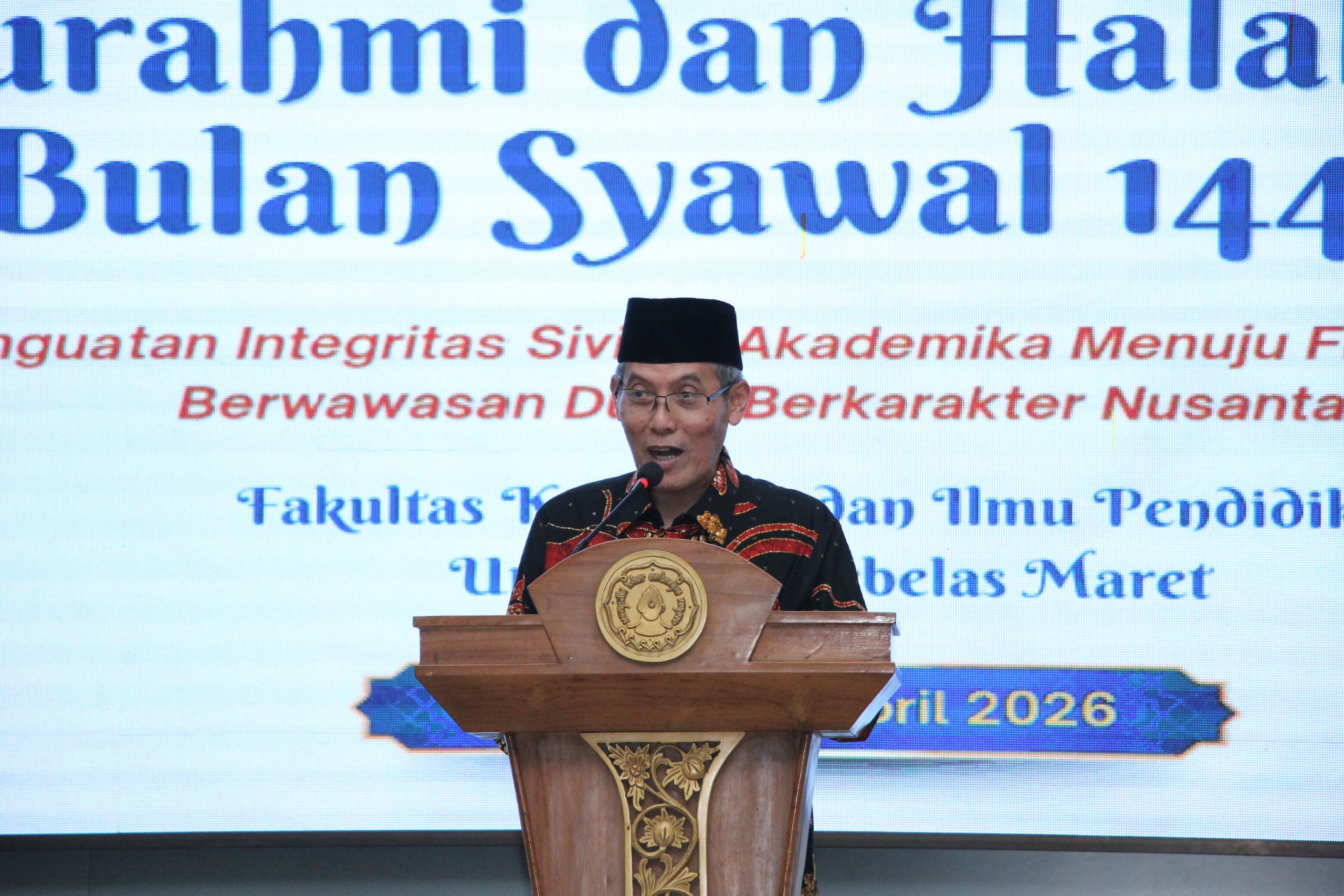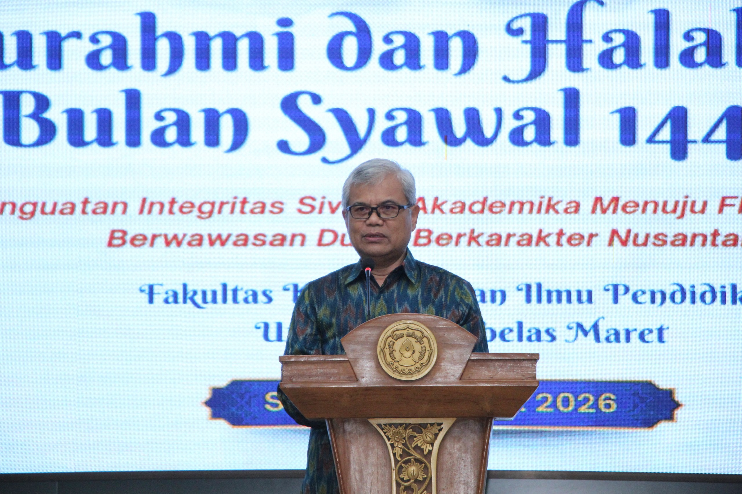 FKIP UNS – Fakultas Keguruan dan Ilmu Pendidikan (FKIP) Universitas Sebelas Maret (UNS) menyelenggarakan kegiatan Silaturahmi dan Halal Bihalal Bulan Syawal 1447 Hijriah pada Rabu (1/4/26) di Aula Lantai 3 Gedung F FKIP UNS. Kegiatan ini dihadiri oleh jajaran pimpinan universitas, dosen, tenaga kependidikan, serta tamu undangan dalam suasana penuh kehangatan dan kebersamaan.