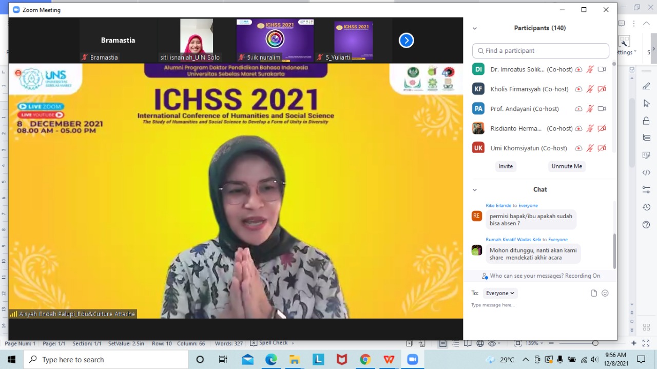 FKIP - Program Doktor Pendidikan Bahasa Indonesia (PBI) Fakultas Keguruan dan Ilmu Pendidikan (FKIP) Universitas Sebelas Maret (UNS) Surakarta mengadakan International Conference Of Humanities and Sosial Science (ICHSS) bertema “The Study of Humanities and Social Science to Develop a Form of Unity in Diversity” pada Selasa (7/12/2021). Acara ini dihadiri Prof. Dr. Jamal Wiwoho, S.H.,