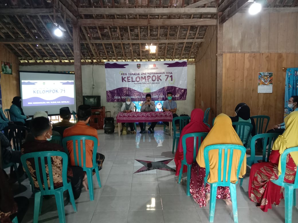 FKIP – Sejumlah mahasiswa Universitas Sebelas Maret (UNS) Surakarta yang tergabung dalam Kelompok Kuliah Kerja Nyata (KKN) 71 melaksanakan kegiatan program kerja di Desa Gondanglegi, Kecamatan Klego, Kabupaten Boyolali. Kegiatan KKN dilaksanakan mulai 19 Januari – 1 Maret 2022. Kegiatan KKN ini diketuai oleh Agus Riyanto, mahasiswa Program Studi (Prodi) Sosiologi Fakultas Ilmu Sosial dan