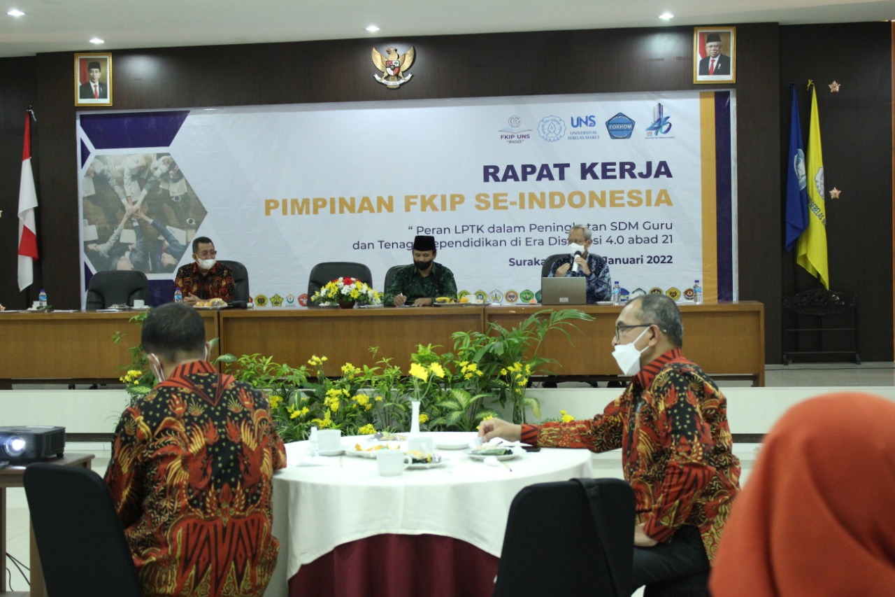 FKIP - Pimpinan Fakultas Keguruan dan Ilmu Pendidikan (FKIP) Negeri se-Indonesia menggelar agenda rapat kerja dengan tema "Peran LPTK dalam Meningkatkan SDM Guru dan Tenaga Kependidikan di Era Distrupsi 4.0 Abad 21". Kegiatan ini dilaksanakan secara luring di UNS Inn pada Sabtu (29/1/2022). Rapat Kerja Pimpinan FKIP Negeri se-Indonesia turut mendiskusikan materi mengenai isu strategi